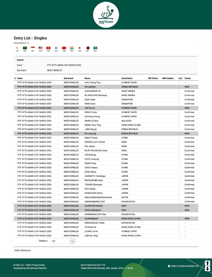 #海口亚洲杯梁靖崑退赛# 据@乒乓_rankings :乒乓球海口亚洲杯,梁靖崑已不在官网报名名单中,替换为陈俊菘。