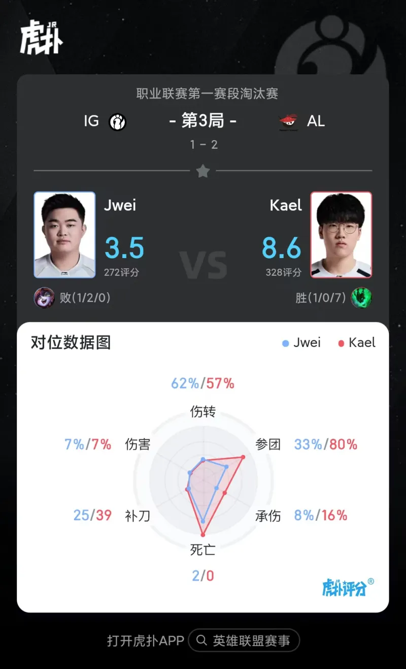 Kael锤石打出1/0/7战绩,拿到AL对阵IG赛点局MVP